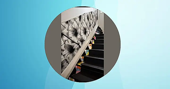 And check out those super cool tiles on the stairs! It’s like someone decided to turn a Rubik’s Cube into stairs, which is both awesome and a little bit dizzying. The combination of the black steps, colorful tiles, and floral wallpaper is like a party for your eyes, proving that staircases don’t have to be just a way to get from one floor to another – they can be a work of art!