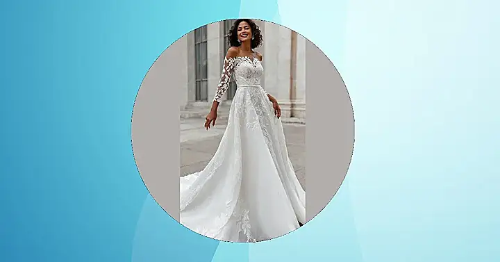 This dress is the perfect example of “off-the-shoulder wedding dresses” done right! It’s got that romantic, whimsical feel that would be perfect for a garden wedding, a castle wedding (like in the picture!), or even a super fancy ballroom. It’s so pretty it almost makes you want to plan a wedding just so you can wear it! Plus, imagine all the awesome photos you could get in a dress this beautiful – and it’s got long sleeves, which is perfect if you’re getting married when it’s a little chilly. Seriously, wedding dress goals!