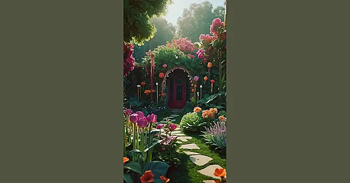 Imagine a place where flowers bloom in every colour imaginable, and a magical path leads to a mysterious red door. This is no ordinary garden; this is a secret garden! The air smells sweet with the scent of roses and honeysuckle. Sunbeams dance through the leaves, creating shimmering patterns on the grass. It’s the kind of garden that makes you wish you could step inside and explore its hidden wonders!