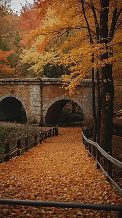 This scene makes you feel like autumn is more than just a season; it’s an escape, a chance to slow down and appreciate the beauty around us. Even if you’re not walking on this path in real life, you can still feel the magic of autumn in every detail. The fallen leaves, the stone bridge, and the warm colors all combine to create a feeling of peace and tranquility. It’s the perfect place to relax, breathe in the fresh air, and let your imagination wander.