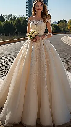Seriously though, this isn’t your grandma’s wedding dress (unless your grandma is super trendy, which, awesome!). It’s got that off-the-shoulder thing going on, which is stylish and lets you show off your collarbones (if that’s your thing!). Plus, all the lace details are super delicate and pretty. You’d totally rock this at a fancy castle or a fun backyard party – whatever floats your bridal boat!