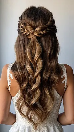 Let’s be honest, some stunning hairstyles look like they require a team of tiny fairies working round the clock, but this half-up braided wonder pictured here is the kind of magic that makes you feel instantly fancy without needing fairy dust. Those perfectly placed braids creating a crown effect, flowing into effortless waves? It’s basically the hair equivalent of finding an extra fry in your order – a simple joy that makes your day way better. Plus, it totally hides those awkward frizz moments on top, while letting your beautiful length shine.