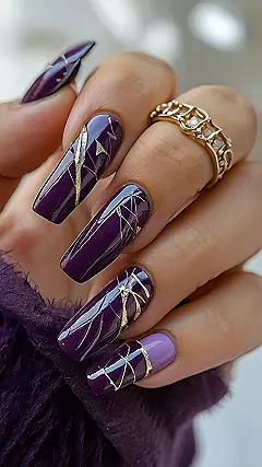 Those purple nails are seriously goals! They’re like the royal family of manicures, rocking that deep, rich color. And that gold swirl design? It’s giving off major “I’m too glam to give a damn” vibes. Bet you could totally hypnotize someone with those nails. Just kidding… mostly.
