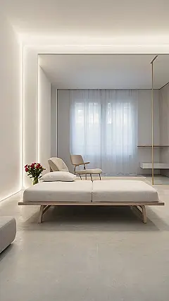 This bedroom is like a breath of fresh air! It’s so clean and simple, it almost feels like a spa. With only a bed, a couple of pillows, and a tiny bedside table, this room is basically a minimalist’s dream. It’s like they took the whole “less is more” idea and ran with it! Even the walls are super plain, which makes the bed stand out even more. It’s so peaceful and calming, you’d think it was a zen garden, not a bedroom!