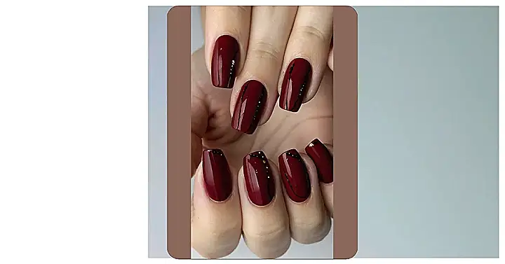 These nails are absolutely stunning! That deep, rich wine color is perfect for anyone who wants to feel sophisticated and maybe a little bit mysterious. It’s like wearing a tiny, elegant glass of red wine on your fingertips – without the risk of spilling! The little gold specks and black lines are like extra sprinkles of fancy; they add just the right amount of pizzazz without being too over-the-top. Imagine how many compliments you’d get showing these off!