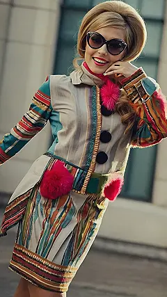This outfit is definitely a blast from the past! With its bold colors and patterns, this look screams “sixties” and reminds us of a time when big hair, bright colors, and mod styles were all the rage. The fluffy pink pom-poms on the jacket and skirt are a perfect touch of whimsy, and the oversized sunglasses just add to the cool factor. This outfit is perfect for a party, a night out, or even just a casual stroll down the street, and it’s sure to turn heads wherever you go!