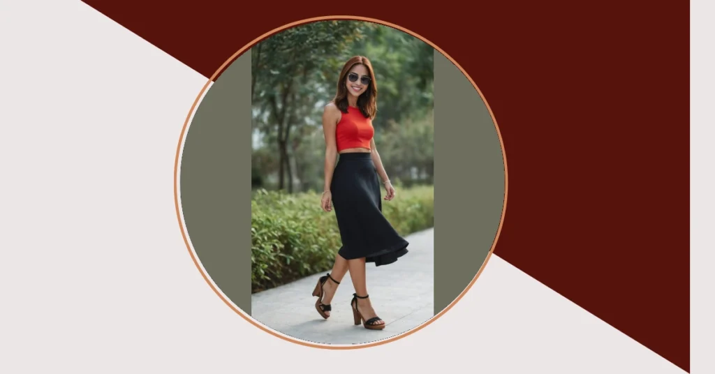 This outfit is giving major “I’m ready for anything” vibes! The black skirt and red crop top combo is a classic look that’s super flattering and always on-trend. It’s like a fashion equation: black plus red equals awesome! And those heels? They’re the cherry on top! They’re like a statement piece that says, “I’m confident and I know it!”