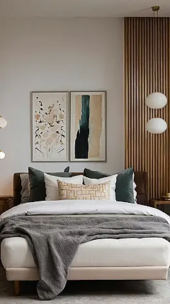 So, you’re ready to ditch the posters of your favorite band (at least for now) and level up your bedroom, huh? Check out this chill zone! It’s got that “I’m an adult, but still cool” vibe. The artsy pictures and wooden paneling give off major relaxed artist feels. It’s like if a fancy art gallery and a cozy cabin had a baby – and that baby was your new bedroom!