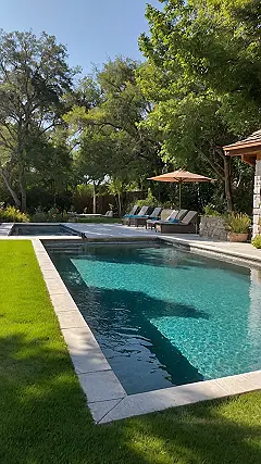 Seriously, this pool area is goals! The design is so chill and relaxed, it’s almost as if someone poured zen into a concrete mold and added a swimming pool. Those little details, like the neatly trimmed grass and the way the trees frame the whole scene, are what make it extra special. It’s the kind of place where you could easily spend a whole summer just chilling and soaking up the sun (with sunscreen, of course!). Plus, those lounge chairs are calling your name; who needs a pool party when you can have your own personal pool paradise?