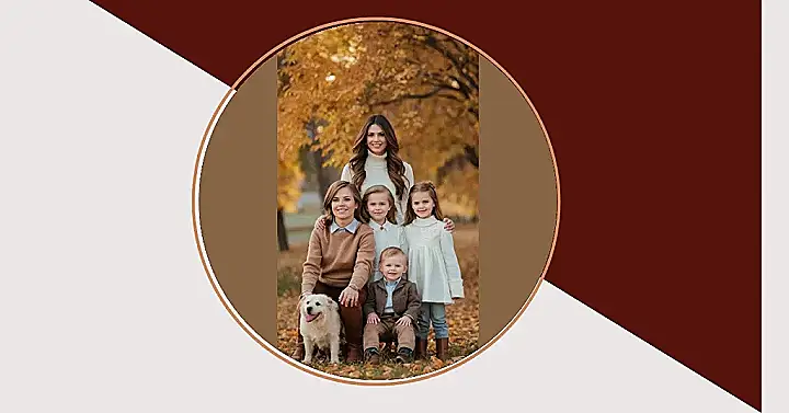 Fall is the perfect time for family photos, and this group looks like they’re rocking their fall outfits. The kids are adorable in their sweaters and boots, while the parents look stylish and comfy. The golden leaves and the cute dog add the perfect touch of autumn magic to this picture. It’s the kind of photo that you’ll want to frame and put up on the wall so you can look at it and smile whenever you walk by! It’s basically a reminder that good times are always better with family.