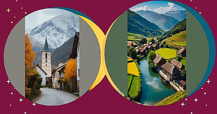 This photo is like a postcard from a fairytale! Imagine a village tucked away in a stunning valley, where the houses are all huddled together like friendly neighbors, their terracotta roofs glowing under the sun. A bright turquoise river snakes its way through the scene, almost like a shiny ribbon, and a tiny wooden bridge looks like it’s just waiting for someone to cross it on a romantic adventure. It’s the kind of place where you could easily spend a whole summer, hiking the nearby hills and swimming in the crystal-clear water. Seriously, I bet the air smells like pine trees and fresh-baked bread!