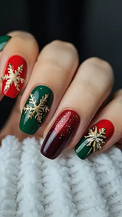 Seriously, look at those gorgeous colours! The rich reds and deep greens are totally Christmas-y, and those sparkly gold snowflakes are just the right touch of glamour. Picture these nails against a backdrop of snowy landscapes or twinkling Christmas lights – total festive perfection! They’re so pretty, you might even forget to open your presents! (Just kidding… mostly.)
