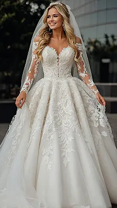 Wearing a dress like this gorgeous creation, complete with the fancy sleeves and sparkly crown, must feel absolutely magical. It’s the ultimate princess moment, even if you’re just heading to the local park (like it looks in the picture!). You’d probably feel so beautiful you wouldn’t even care if you accidentally stepped on the hem a million times. It’s definitely the stuff ‘dream wedding dresses’ are made of – big, beautiful, and maybe slightly impractical, but totally worth it for the epic pictures and feeling like you’re the star of your own show.