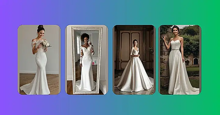Wow, check out that stunning white wedding dress! It’s like something straight out of a fairytale, but with way more sparkle. The beautiful lace bodice is super fancy, and the sleek satin skirt is just begging to twirl in. Imagine yourself walking down the aisle in this masterpiece – you’d totally steal the show! It’s the kind of dress that makes you feel like a princess, without having to actually rescue a prince (unless you want to, of course!).