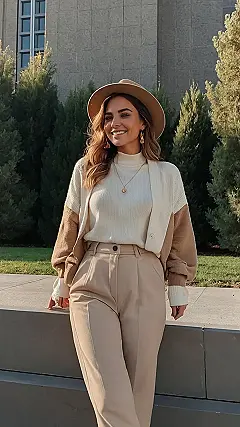 This outfit is proof that you don’t need a million colors to look amazing. The model is rocking a super stylish combo of beige, brown, and white – a totally chic and timeless look. You can totally copy it! Just grab your favorite white sweater (maybe one with a cool turtleneck!), a brown cardigan, and some sleek beige pants. Add a cute hat and some earrings, and bam! You’re ready to take on the world, or at least your next class.
