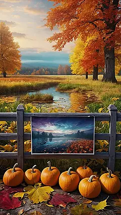 This picture is like a scene straight out of a fairytale! Imagine yourself walking through a forest, the air crisp and cool, the leaves crunching under your feet. The trees are all decked out in their finest fall colors, a mix of fiery oranges, deep reds, and golden yellows. You come across a little stream, sparkling like a jewel in the sunlight. And then, you see them – pumpkins! Scattered around like giant orange jewels, they’re just waiting to be picked and carved into spooky faces or delicious pies.