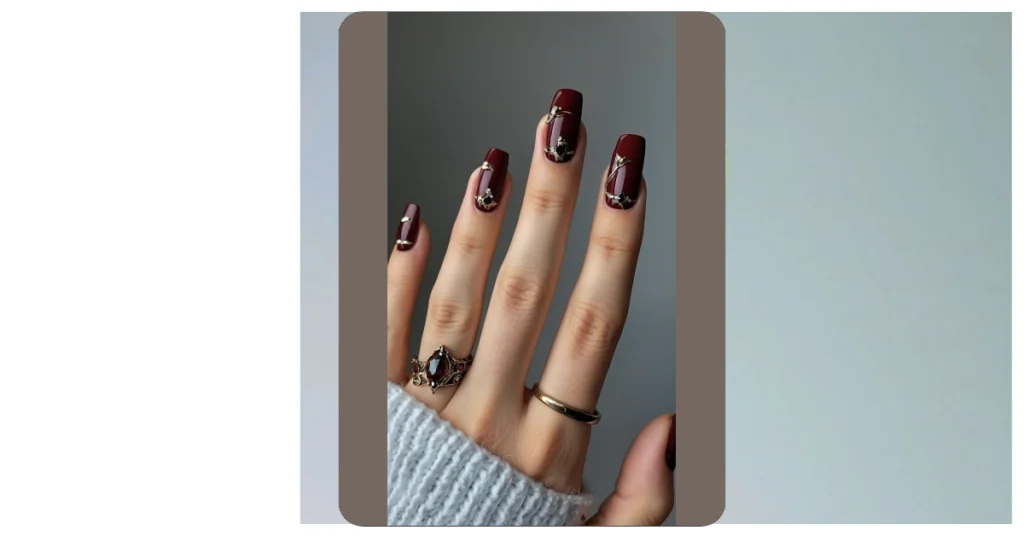 These nails are like a fancy dress party for your fingertips! The deep burgundy is perfect for fall, and the glittery gold accents are like the little sparkles you see in the leaves when the sun hits them just right. It’s like someone took all the good stuff from fall and put it on your nails.