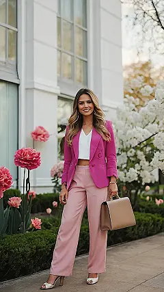 Picture this: you’re strolling into school next spring looking like you just stepped out of a magazine! Rocking a hot pink blazer with flowy pastel pants like the outfit in the picture? Total boss vibes. Who needs superpowers when you have killer style? You’ll be acing tests and leading the pep rally all while looking super fresh.