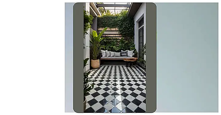 Imagine having your own little rainforest inside your house! This picture shows a super cool house interior garden, complete with a comfy bench perfect for reading a book or just chilling. The black and white checkered floor adds a fancy touch, like a game board waiting for a fun match. I bet it feels super peaceful and calming in there, especially with all that lush greenery surrounding you – it’s way better than any boring old hallway!