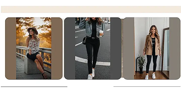 This outfit is totally rocking the “fall casual” vibe! Imagine strolling through a park with crisp air and colorful leaves all around you. This girl is totally ready to grab a pumpkin spice latte and soak up the season. She’s comfy in her black jeans and simple black shirt, but that tan blazer is the star of the show. It adds a touch of sophistication while keeping things laid-back. And the white sneakers? Those are the perfect finishing touch for a casual, yet stylish look!