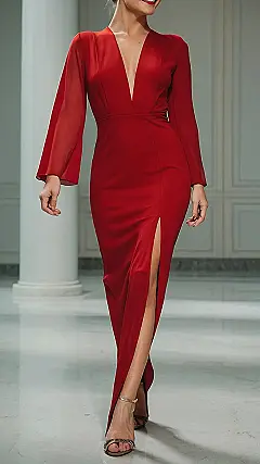 This dress is like a superhero costume for parties! It’s got that classic red color that makes you feel like a total rockstar, and the long sleeves and flowing skirt give it that elegant vibe that’s perfect for a fancy event. Plus, it’s got a sneaky slit in the skirt that lets you show off a little leg, so you can feel confident and glamorous without being too over-the-top.