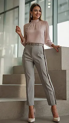 Those pants? They’re not just pants; they’re like a power move in fabric form! Paired with a sleek top and that eye-catching belt, you’re practically telling everyone, “Yeah, I got this.” It’s the kind of outfit that says you’re ready to crush your goals, look amazing while doing it, and maybe even inspire some serious outfit envy among your coworkers. Go get ’em, tiger!