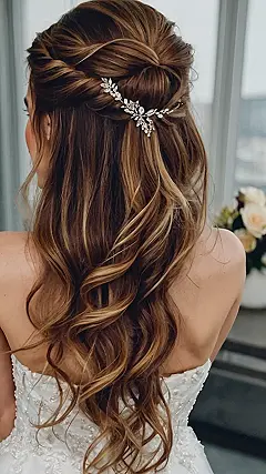 This hairstyle is seriously to-die-for! Imagine rocking this look on your wedding day – a stunning, romantic half-updo with loose, wavy curls cascading down your back. Those sparkly hair clips? They’re like tiny constellations adding extra magic to an already amazing ‘do. It’s the perfect blend of elegant and playful, making you feel like a total princess without being too fussy. It’s so drop-dead gorgeous, it’s practically guaranteed to make your wedding photos unforgettable.