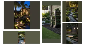 This garden is like a fancy party for your eyes! It’s all about the little details: perfectly shaped bushes that look like they’re wearing tiny hats, fancy lamps that glow softly, and a pathway that whispers “come on in, let’s have a good time.” It’s the kind of place where you can sip lemonade in a fancy dress, even if it’s just a pretend one in your imagination.