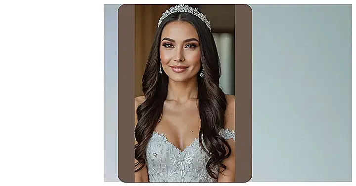 This bride is rocking a look that’s totally glam! Her hair is pulled back in a chic bun, and it’s adorned with a sparkling headband that looks like a crown. She’s definitely feeling like a princess, and who wouldn’t? Her makeup is on point, too, with just the right amount of sparkle.