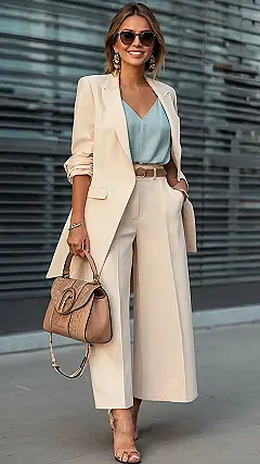 This outfit is like a magic trick! It’s super simple, yet it makes the model look absolutely stunning. It’s the perfect example of how a few key pieces – a stylish blazer, some wide-leg pants, and a pretty top – can create a look that’s both comfortable and seriously chic. No need for crazy patterns or tons of jewelry; this proves that less can totally be more! It’s basically the style equivalent of a perfectly baked chocolate chip cookie – simple, classic, and impossible to resist.