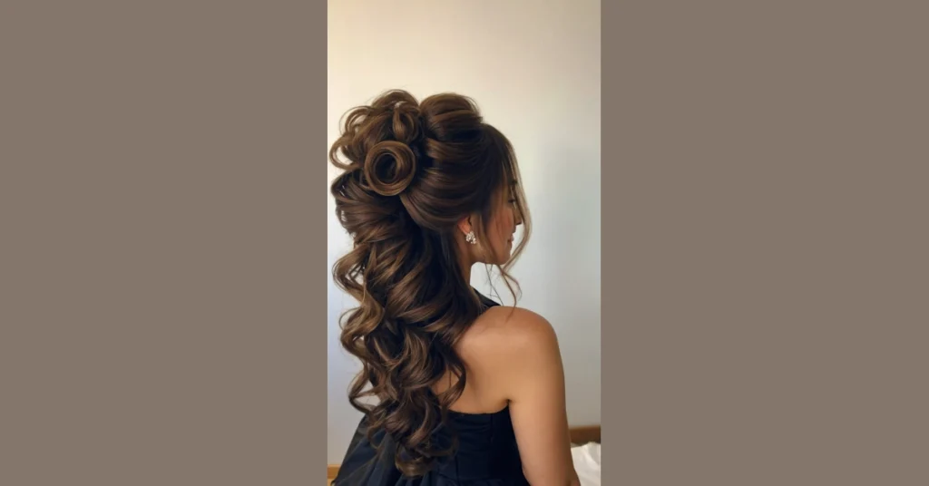 Wowza! Check out this hairstyle – it’s like a chocolate waterfall of curls, all perfectly sculpted and ready for a fairytale wedding. It’s totally jaw-dropping, right? I mean, who needs a tiara when your hair looks this amazing? It’s so fancy, you’d think it took a whole team of hair wizards to create, but secretly, I bet you could rock a similar look with some practice and a whole lot of hairspray!
