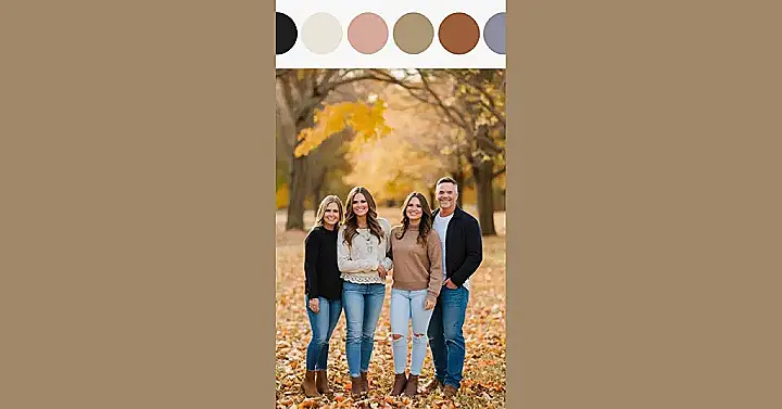 So you want to look your best for your fall family pictures, but you have no idea what to wear! Don’t worry, it’s easier than you think. Look at this amazing color palette, it’s like a cheat sheet for all the best fall colors! There’s earthy browns, deep greens, and a touch of black for that extra pop. You can even add a little white to brighten things up.