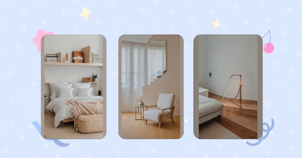 This room might look super simple at first glance, but don’t be fooled! It’s like that friend who’s always quiet but secretly has a million stories to tell. There’s a cool lamp that looks like it’s made from a bunch of sticks, and the floor is a mix of different shades of wood, making it look like a puzzle. The whole room is super clean and airy, with just a few things to break up the space. It’s like the perfect spot to relax and let your mind wander.