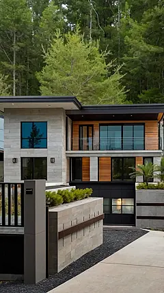Imagine rolling up to this place after a long day at school. It’s so cool looking, like something straight out of a movie! The stone and the wood blend perfectly, making it super modern and fancy. Plus, that balcony is screaming for some string lights and a chill hangout spot. I bet they have a smart fridge inside that orders pizza automatically.