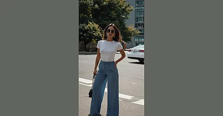 This outfit is like that friend who always looks amazing, even when they say they just threw something on. It’s simple, but the details are what make it stand out. A white tee and flowy pants are like the classic peanut butter and jelly of fashion, always good, always together. And those shades? They’re the cherry on top, making the whole thing feel just a bit cooler.