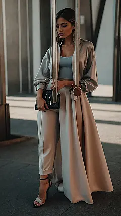 This outfit is the perfect example of “classy casual.” It’s got a touch of sophistication with the blazer, but the wide-leg pants and crop top keep it cool and comfy. Imagine you’re heading to a coffee shop to meet your friends, but you also want to look like you’re about to conquer the world. This outfit is basically the fashion equivalent of a superhero landing in a trendy cafe, ready to order a latte and discuss world domination (or just gossip, but hey, it’s all about confidence!).