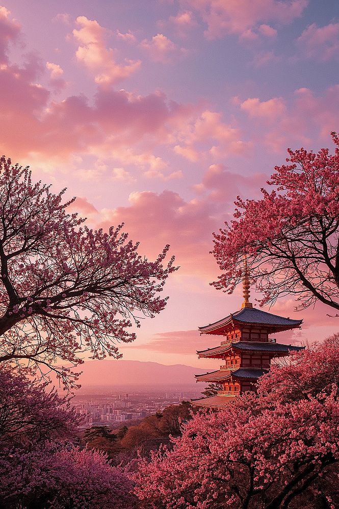Experience the serene magic of a peaceful Japan temple bathed in the soft light of sunrise, surrounded by a delicate sea of cherry blossoms. This image embodies the tranquil Japan aesthetic, perfect for travel inspiration.