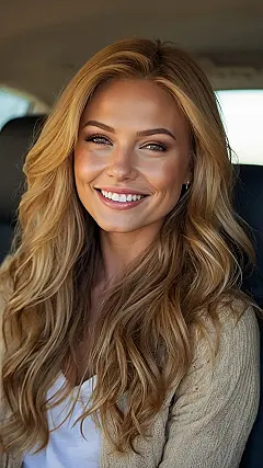 This girl is rocking the honey blonde hair look! Seriously, those locks are like sunshine bottled up. It’s the perfect hair color for summer, and it makes her eyes look even brighter. Her smile is so big and happy, I bet she’s got a whole lot of fun adventures planned. Plus, her outfit is super cute. She’s got that “I’m ready for anything” kind of vibe. Maybe she’s about to head off on a road trip or maybe she’s just chilling in her car, but one thing’s for sure, this girl is ready to shine!