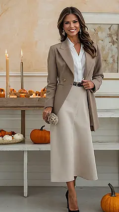 This look is all about effortless elegance. You’ll be the belle of the ball – or, you know, the belle of the Thanksgiving dinner table. The beige skirt and taupe blazer are a match made in fashion heaven, and honestly, you’ll probably want to wear this combo well beyond the holiday season. It’s comfortable enough to tackle all the family activities, stylish enough to make heads turn, and sophisticated enough to make even the fanciest grandma proud. So go ahead, embrace the fall vibes with an outfit that’s as gorgeous as the autumn leaves!