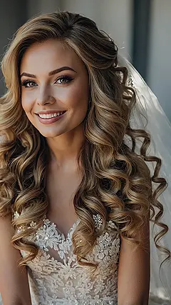 Getting ready for a wedding is basically turning your hair into a work of art that can handle dancing and maybe a little wind. Check out those amazing waves and the sparkle near the veil – it’s like the hair has its own special effects! You probably need a team of stylists and enough hairspray to build a small fort to keep it all looking this perfect, but hey, if you’re going to feel like a princess for a day, your hair totally needs the crown and the volume.