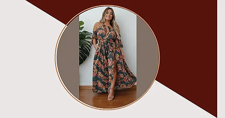 The image shows a model wearing a gorgeous maxi dress, perfect for those crisp autumn days. It’s like a flower garden exploded all over her! The flowing fabric, vibrant colors, and cool fall tones would make anyone want to twirl and embrace the season. Plus, you can imagine the leaves crunching under your feet as you stroll in this dress!