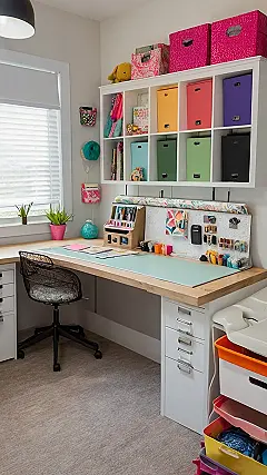 Does your room look like a glitter bomb exploded? This craft room office has the cure! Check out all those colorful boxes up on the shelf – they’re like rainbow-colored treasure chests for all your stickers, yarn, and secret crafting supplies. Imagine how much less time you’d spend digging for that one specific shade of blue paint, and more time actually making awesome stuff.