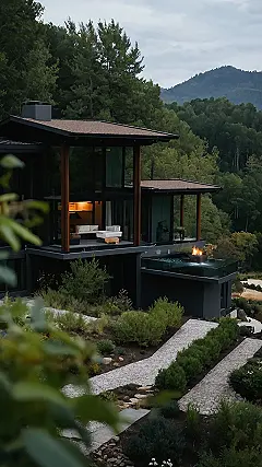 This house is like a fancy, grown-up version of a gingerbread house, with lots of windows so you can peek inside and see all the cool stuff. It’s got sleek lines, a bit of a mysterious vibe, and a lawn so perfectly manicured it looks like a giant green carpet! Imagine sitting on that patio and just relaxing with a good book – you’d feel like you were in a movie!