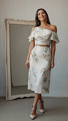 This summer dress is seriously giving off major flower power! It’s like you’re wearing a whole garden, which is way cooler than actually weeding one. The off-the-shoulder style is perfect for soaking up some sun (don’t forget the sunscreen!), and the whole outfit just screams “picnic in the park” or “ice cream date” vibes. Plus, imagine how great you’d look twirling around in this thing!