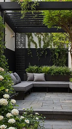 Need a chill spot that feels miles away without actually leaving? Check out this scene! It’s got that cool wooden trellis climbing up the wall, looking like a giant fancy ladder for plants who are probably trying to sneak out and grab pizza. And peep that cozy bench with the cushion – it’s practically begging you to sit there and pretend you’re in a secret hideaway in Italy, maybe planning your next move to avoid homework. It’s got major courtyard vibes, like a tiny slice of vacation right there, just minus the 10-hour flight and questionable airplane food.