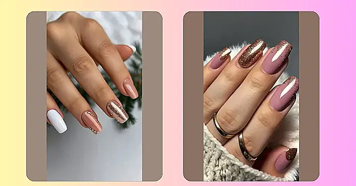 These nails are seriously cute! Imagine cozying up by the fireplace with a hot chocolate, and BAM! Your nails are like tiny, sparkly winter sunsets. The dusty rose color is totally chill, and the little bit of gold glitter is like a sprinkle of magic – perfect for those holiday parties or just looking extra fab during the cold months. It’s the kind of manicure that screams “I’m ready for snow days and hot cocoa,” without actually having to say it.