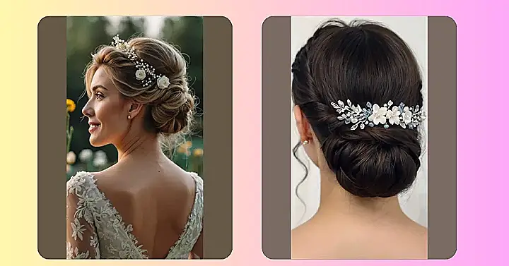 This hairstyle is seriously stunning! Imagine yourself walking down the aisle, looking like a total princess with this gorgeous floral bun. It’s like a fairytale come to life—all those delicate flowers and sparkly details are just perfect for a wedding. Forget the messy bun you usually throw together – this is next-level bun perfection, ready to steal the show and make your wedding photos absolutely unforgettable.