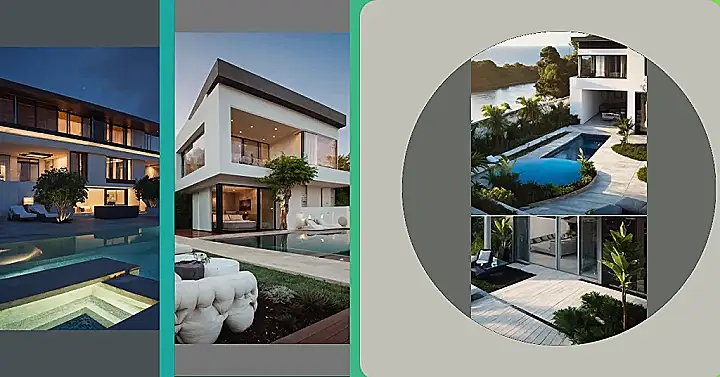 This house is like a scene straight out of a magazine! It’s got all the fancy features you’d expect from a “glamour house”: sleek lines, modern design, and a pool so clear it looks like a giant mirror reflecting the sky. The stairs are a real showstopper, twisting like a ribbon up to the next level. Imagine the feeling of walking up those steps every day, knowing you’re about to enter a luxurious haven!