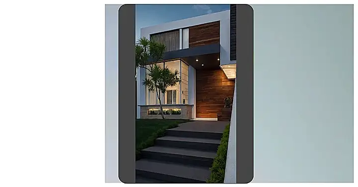 This house is like something out of a magazine! It’s got all the fancy stuff you’d expect from a glamour house: sleek lines, modern design, and even a super fancy door with a giant window. Just imagine walking up those steps, feeling like you’re about to enter a palace (but without the royalty). It’s the kind of place that makes you wish you could live there forever, even if you had to share it with a very cool-looking dog who seems to be enjoying the fancy porch like it’s their own personal throne.