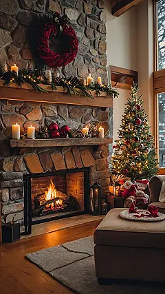 This picture is like a cozy hug on a cold winter night! Imagine settling down in this room, surrounded by flickering candlelight and the scent of pine needles. It’s a perfect winter wonderland, complete with twinkling candles, rustic wooden decor, and even a few adorable woodland creatures, ready to celebrate the holidays!